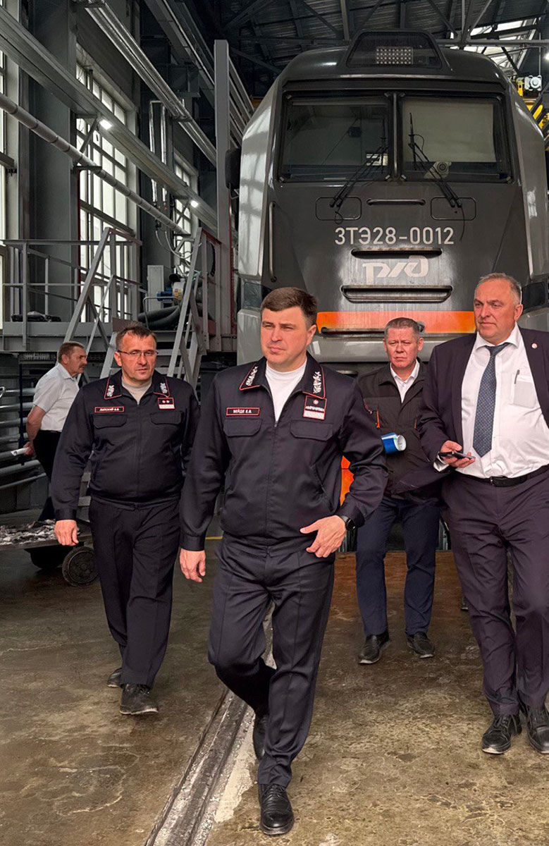С начала 2025 года в депо «Тында-Северная» поступило 20 магистральных грузовых тепловозов 3ТЭ28. Всего, с января 2024 года, - 55 таких машин, которые проходят на предприятии техническое обслуживание в объеме ТО-2, ТО-3 и текущий ремонт в объеме ТР-1. В данное время работы выполняются на имеющихся мощностях. В процессе реализации первого этапа реконструкции локомотивного депо Тында для обслуживания тепловозов новых серий в объеме ТО-3 и ТР-1 ОАО «РЖД» построен новый цех. После запуска его в эксплуатацию в нем будут обслуживаться локомотивы 3ТЭ28 и 2ТЭ25А. Дмитрий Пегов осмотрел технологическое оборудование, смотровые канавы, химико-техническую лабораторию, отделение по ремонту топливной аппаратуры и дал положительную оценку их подготовке к предстоящей эксплуатации.