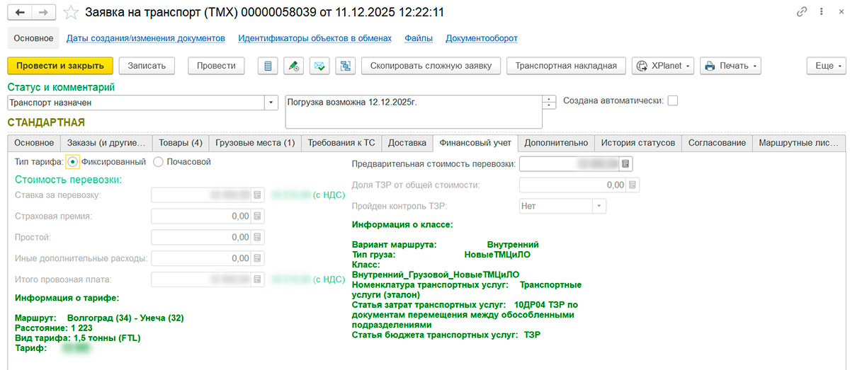 В целях бюджетного контроля внедрен классификатор транспортных расходов, и установлен лимит по каждому классу. При оформлении заявки 1С ERP выдаёт расчёт предварительной стоимости транспорта. Система автоматически отслеживает расход бюджета по перевозкам и блокирует заказы при превышении установленного лимита.