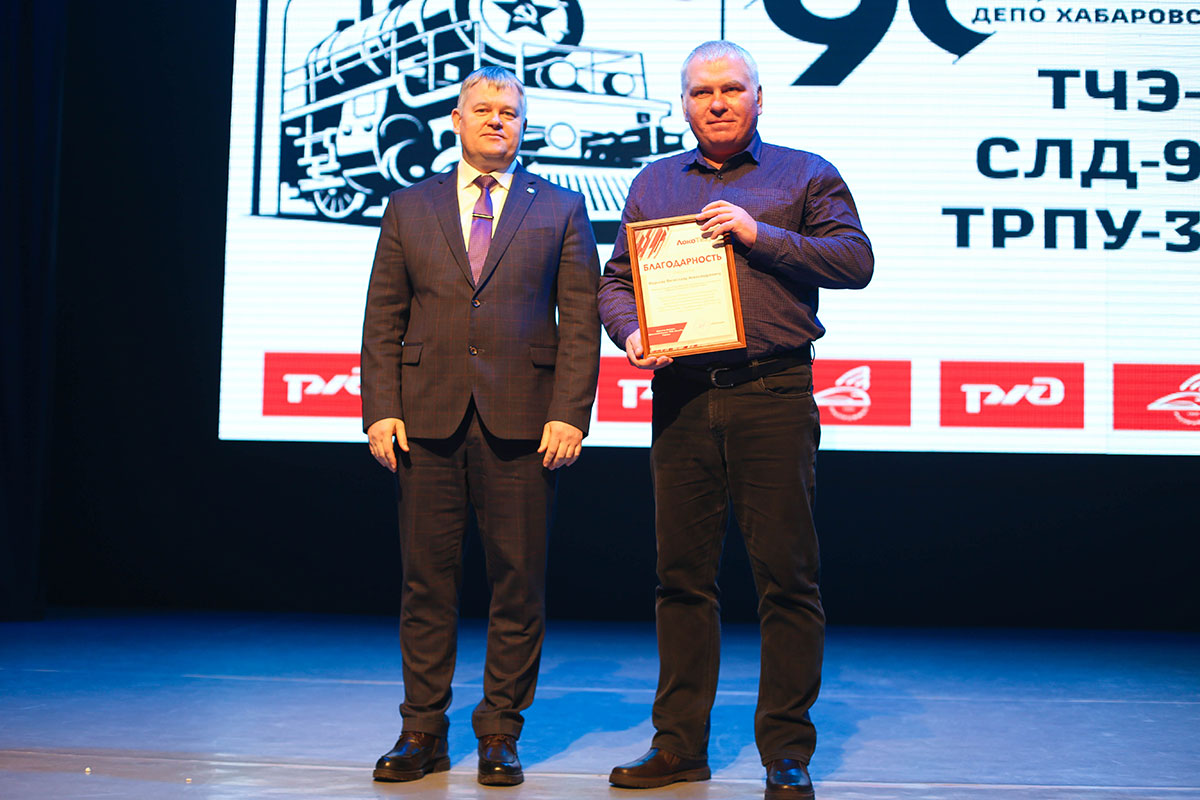 Основная часть праздника была посвящена чествованию коллективов обоих предприятий - им вручили награды от Дальневосточной железной дороги, региональных органов власти, руководства группы компаний «ЛокоТех». Были отмечены более 40 работников депо Дальневосточное, среди них - кузнец на молотах и прессах Максим Матюхин, который получил благодарственное письмо Минпромторга, слесарь Андрей Бочаров – благодарственное письмо Минтранса, мастер участка Дмитрий Ермолаев – благодарность начальника ДВЖД.