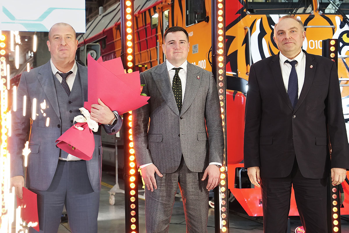 Благодарность Андрею Витальевичу вручил заместитель генерального директора ОАО «РЖД» - начальник Дирекции тяги Дмитрий Пегов в рамках презентации локомотивов с юбилейными номерами, состоявшейся на Брянском машиностроительном заводе (БМЗ). Торжественная передача заказчику 2ТЭ25КМ-800 и 3ТЭ28-100 стала символичным событием – сотни локомотивов производства ТМХ сегодня обеспечивают стабильное сообщение на стратегически важных полигонах железных дорог нашей страны.