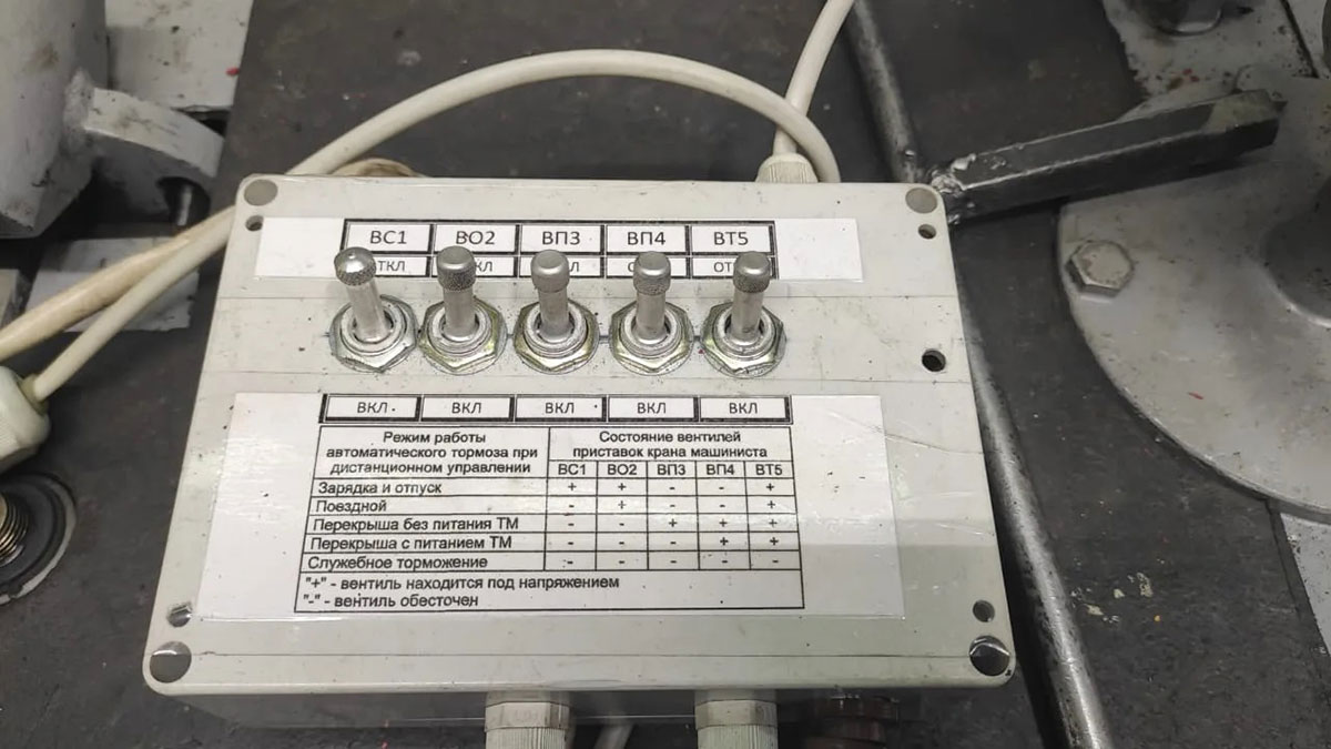 «Ключевым элементом модернизации стенда стало создание блока управления, который имитирует работу контроллера крана машиниста. Он позволяет в ручном режиме подавать и отключать электропитание на клапаны приставок 395М.100 и 395М.200 с помощью тумблеров. Порядок включения тумблеров точно соответствует алгоритму работы контроллера крана машиниста и позволяет выполнить все необходимые этапы проверки. Для удобства подключения приставок предусмотрены специальные розетки», - рассказал начальник депо «Зиминское» Евгений Цацуев.