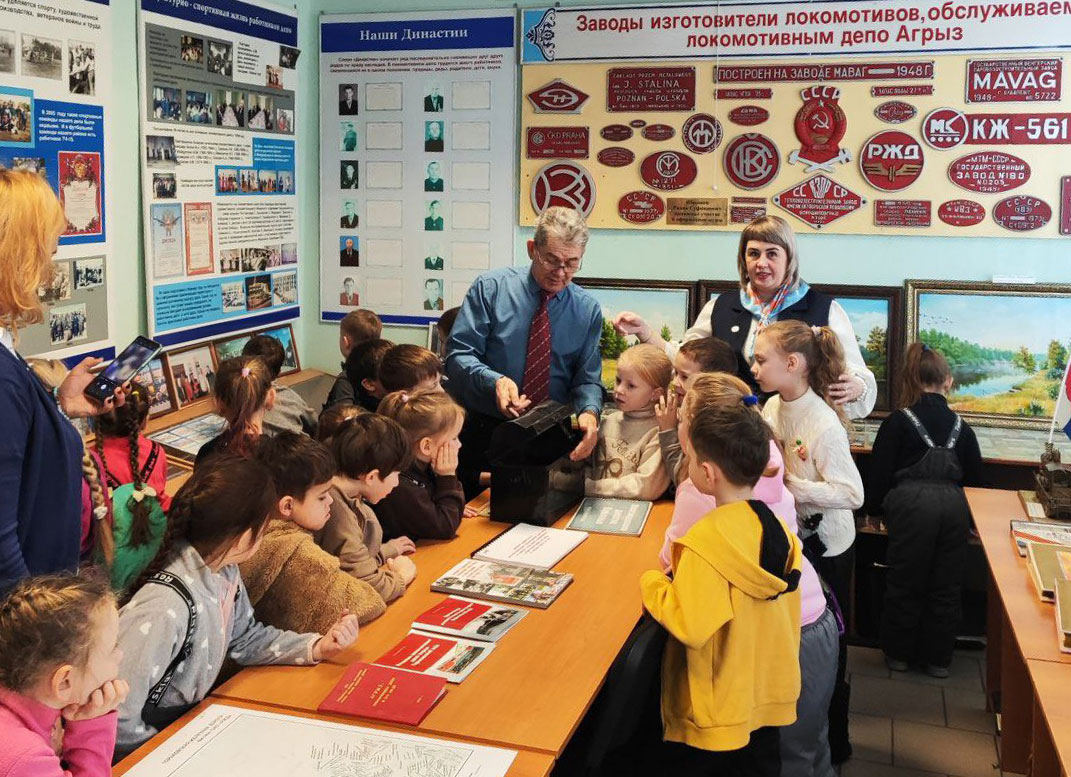 Экскурсия началась с посещения музея боевой и трудовой славы депо. Гидом для ребят выступил его хранитель Сергей Баранов. Он в увлекательной форме рассказал юным гостям об этапах становления депо и людях, посвятивших свою жизнь железной дороге. Дети с большим интересом рассматривали экспонаты и награды, хранящие память о трудовых подвигах агрызских железнодорожников.