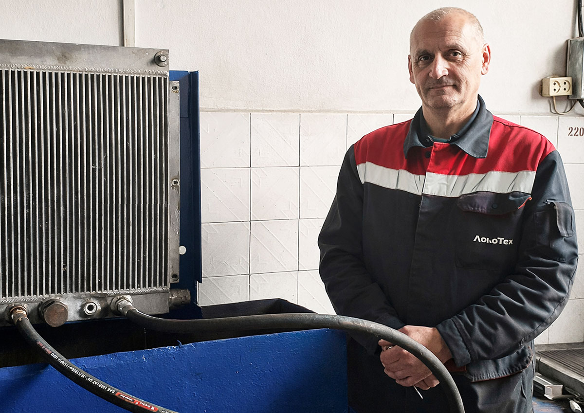 В сервисном локомотивном депо Великолукское Северо-Западного филиала компании «ЛокоТех-Сервис» мастер ремонта заготовительного участка Сергей Казаков создал установку, которая позволяет быстрее устранять неполадки в компрессорной системе тепловоза серии 2ТЭ25КМ. В этих локомотивах используется агрегат компрессорного типа АКВ-4,5, на котором установлен масловоздушный холодильник, предназначенный для охлаждения масла, циркулирующего в системе компрессора. Данный узел может выйти из строя из-за нарушения целостности охлаждающих радиаторных трубок. Со временем на них появляются поперечные и продольные трещины, которые и становятся причиной отказа компрессора.