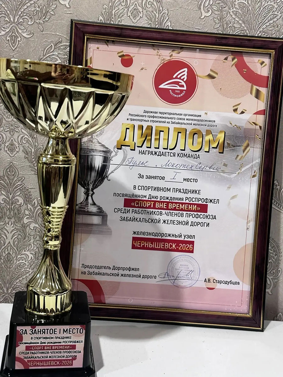 В Сервисном локомотивном депо Чернышевск Забайкальского филиала компании "ЛокоТех-Сервис" царит атмосфера праздника и гордости! Команда депо одержала уверенную победу, заняв первое место среди двенадцати коллективов железнодорожного узла Чернышевск в захватывающих спортивных состязаниях «Спорт вне времени», посвященных Дню рождения РОСПРОФЖЕЛ.