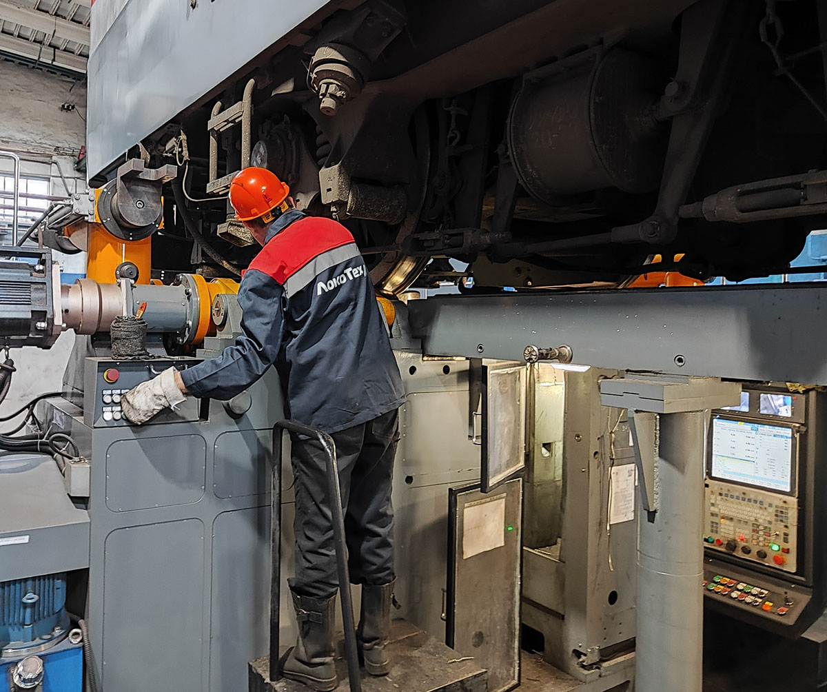 Новый станок ТК 950 ФЗТ был установлен в ноябре 2023 года. Он предназначен для обточки колесных пар рельсового транспорта колеи 1520 мм с нагрузкой на ось до 24 тонн. За время работы новое оборудование уже зарекомендовало себя с положительной стороны: станок универсальный и позволяет точить любые профили колес, датчики считывают информацию и в автоматическом режиме подбирают необходимые параметры. Обновление положительно сказалось на скорости и качестве обточки.