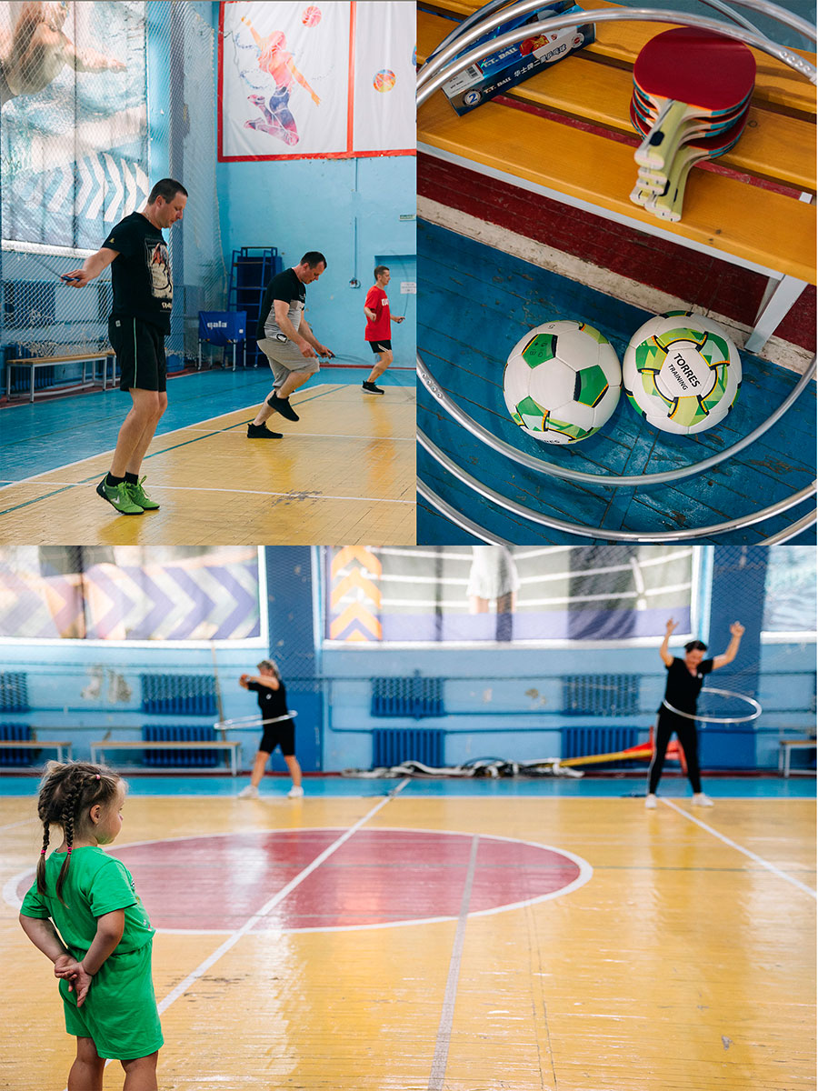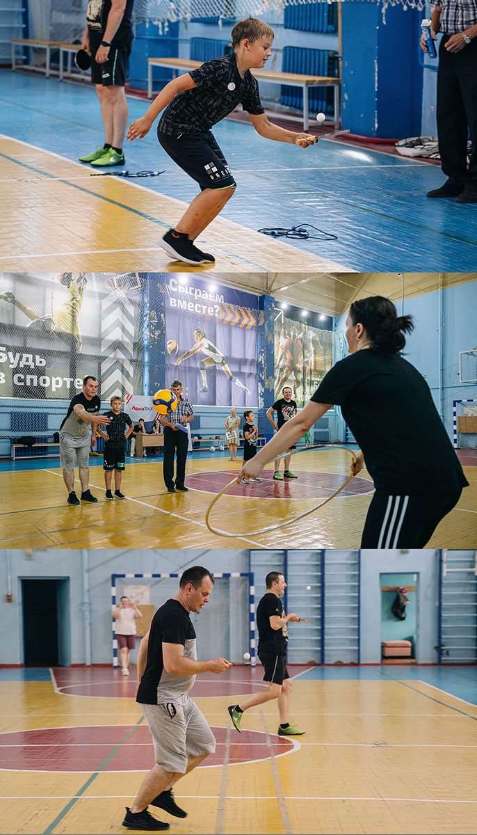 Прозвучали вступительные слова, затем участники начали делать разминку перед заготовленными для них испытаниями. Соревнование состояло из 5-ти упражнений: прыжки со скакалкой, вращение обруча, метание мяча в цель, удары по мячу ногой на точность попадания и заключительное испытание - эстафета с теннисными шариками и ракетками.