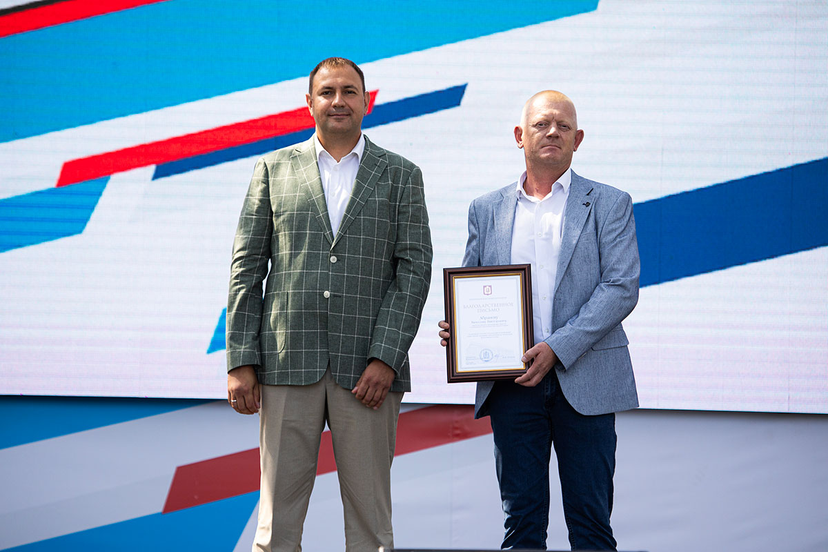 За активное участие в подготовке и проведении общественно значимых мероприятий на территории Красноярского края директору филиала «Красноярский» ООО «ЛокоТех-Сервис» Вячеславу Абрамову министр транспорта Красноярского края Дмитрий Зотин вручил благодарственное письмо от имени Губернатора Красноярского края.