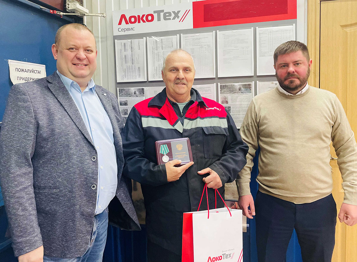 Директор филиала «Южный» компании «ЛокоТех-Сервис» Григорий Юсин вручил юбилейную медаль «50 лет Байкало-Амурской магистрали» слесарю на пунктах технического обслуживания сервисного локомотивного депо (СЛД) «Мичуринск» Валерию Безрядину.