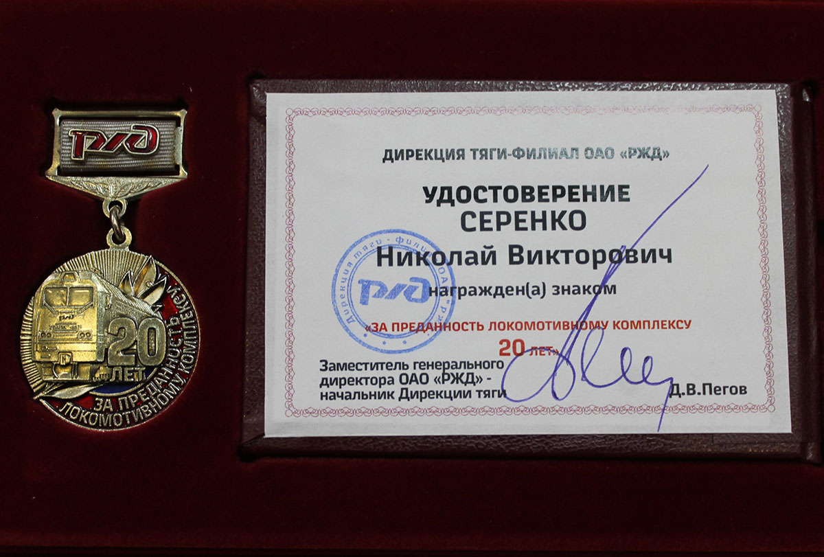 В ходе рабочего совещания в Западно-Сибирской дирекции тяги ОАО «РЖД» в соответствии с приказом Заместителя генерального директора ОАО «РЖД» - начальника Дирекции тяги Пегова Д.В. ЦТК-2/1-160 от 27.12.2024 г. за достижение высоких результатов в профессиональной деятельности, эффективное взаимодействие и значительный вклад в развитие локомотивного комплекса ОАО «РЖД» директор филиала «Западно-Сибирский» ООО «ЛокоТех-Сервис» Николай Серенко был награжден знаком «За преданность локомотивному комплексу 20 лет». Награду вручил заместитель начальника дирекции (по безопасности движения) Сергей Ахмадеев.