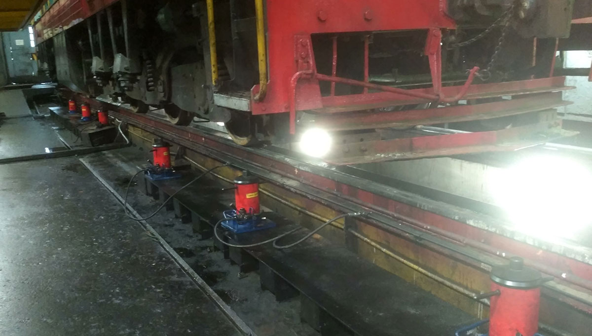 Линия включает в себя 12 гидравлических домкратов, каждый с грузоподъемностью 15 тонн, подъем домкратов осуществляется электрической гидростанцией. Комплект оборудования позволяет проводить вибродиагностику подшипников качения КМБ с одновременным подъемом нескольких КМБ.