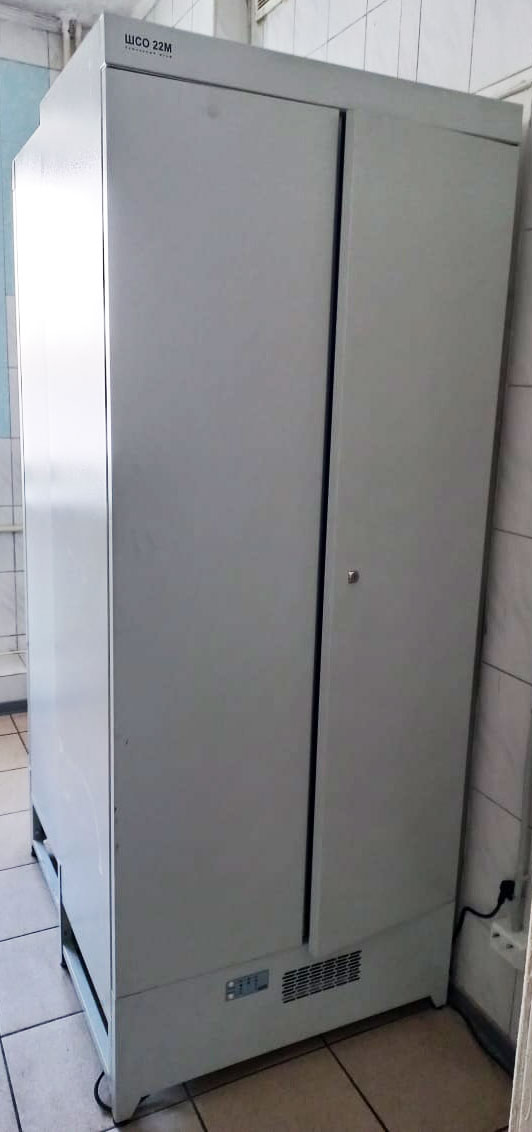 Шкаф используется для сушки влажной одежды и обуви. Температура воздуха внутри оборудования достигает 45°С, благодаря нагнетанию воздуха тепловентилятором. Оборудование состоит из двух базовых элементов: шкафа и подставки, с встроенным блоком нагрева. Верхняя часть представляет общую секцию для просушивания одежды и подвесные полки. На которых можно укладывать для сушки рукавицы, головные уборы или обувь. Оборудование вмещает в себя 4 комплекта одежды для просушки.