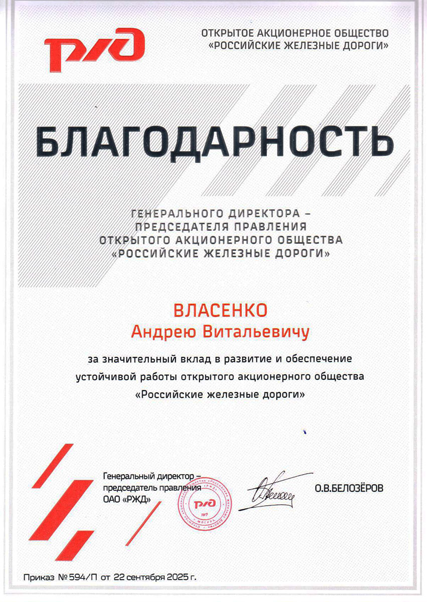 Благодарность Андрею Витальевичу вручил заместитель генерального директора ОАО «РЖД» - начальник Дирекции тяги Дмитрий Пегов в рамках презентации локомотивов с юбилейными номерами, состоявшейся на Брянском машиностроительном заводе (БМЗ). Торжественная передача заказчику 2ТЭ25КМ-800 и 3ТЭ28-100 стала символичным событием – сотни локомотивов производства ТМХ сегодня обеспечивают стабильное сообщение на стратегически важных полигонах железных дорог нашей страны.